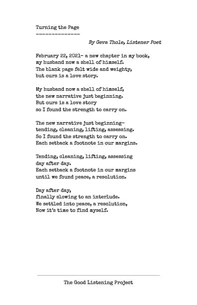 Caregiver Haven is one of TGLP’s newer projects. Because of the support of generous donors, informal caregivers can sign up for a free poetry session via Zoom with a Listener Poet. These sessions are for anyone caring for a parent, spouse or child with a disability. All caregivers are welcome. Each participant will be sent a custom poem within five days of your Zoom call- no strings attached. Please pass along the information, and link below, to anyone you think would benefit from being heard and supported while they care for others.