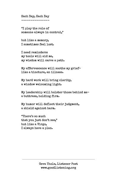 I’m also blessed to work as a Listener Poet with The Good Listening Project. It’s another organization that creates magic. Listener Poets hold space for people in healthcare systems to share whatever’s on their mind in one-on-one listening sessions. We then write each person a custom poem. These poems are also used to facilitate meaningful conversations among colleagues.